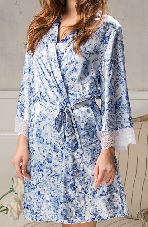 Короткий халат Mia-Amore выполнен из смесовой принтованной ткани. Ажурное кружево расположено по низу рукавов.