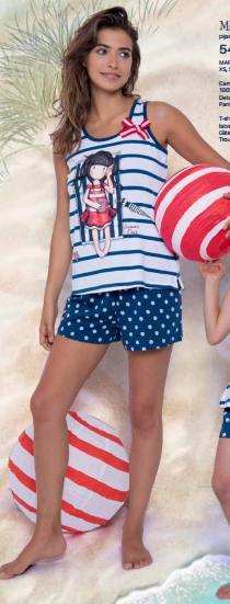 Шорты из принтованного хлопка в горох. Пояс на резинке с регулируемой кулиской. Майка на широких лямках с пришивным бантом, с округлым вырезом горловины. Логотип Santoro на спине. Небольшие боковые разрезы. Декорирована апликацией с глиттером. Упакована в подарочную жестяную коробку.