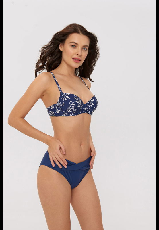 Изысканный и женственный купальник для девушек, знающих себе цену! Выполнен из приятного телу эластичного материала глубокого синего цвета. Лиф дополнен роскошным растительным принтом. Формованные чашки, косточки и боковые корсетные вставки обеспечивают идеальную поддержку. Push up во всех размерах. Тонкие бретели регулируются по длине. Сзади удобная пластиковая застежка. Плавки с низкой посадкой дополнены подкладом. Пояс дополнен изящной драпировкой.