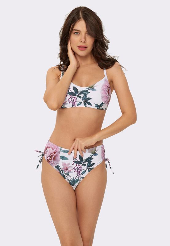 Вся женственность и нежность в одном купальнике! Купальник выполнен из приятного телу эластичного материала. Трендовый ботанический принд создает особую атмосферу легкости. Мягкая чашка с косточками обеспечивает идеальную поддержку, сохраняя естественные женские линии. Тонкие бретели регулируются по длине. Сзади удобная пластиковая застежка. Плавки с актуальной высокой посадкой дополнены подкладом. Завязки по бокам регулируют ширину плавок, добавляя образу игривость.