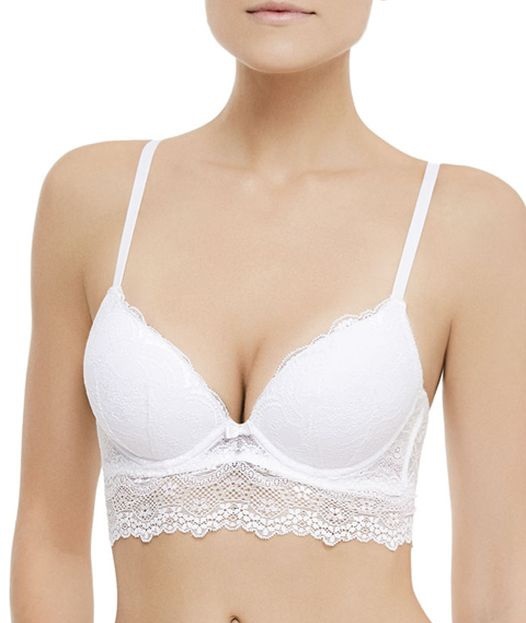 Бюстгальтер с широким кружевным станом и формованными чашками на косточках. Внешняя часть отстрочена кружевом, спереди декоративная аппликация. У модели регулируемые несъемные бретели и хлопковая подкладка чашек.