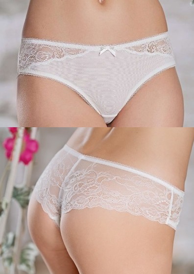 Романтичные и женственные трусики шорты выполнены из ажурного кружева в сочетании с микросеточкой на подкладе из шелковистой микрофибры. Микросеточка украшена рисунком в горошек. Трусики низкой посадки на талии украшены спереди сложным бантиком из атласных ленточек. Ластовица из 100% хлопка гарантирует комфорт при ежедневной носке.