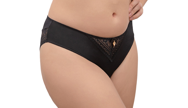 Трусы слип со средней линией талии. Передняя и задняя детали декорированы вставками из эластичного кружева. Срезы задних деталей – фигурная кромка кружева, дополнительно усилены плоской резинкой. Ластовица из хлопкового полотна.Декор:атласный бант и подвеска кружевное сердечко