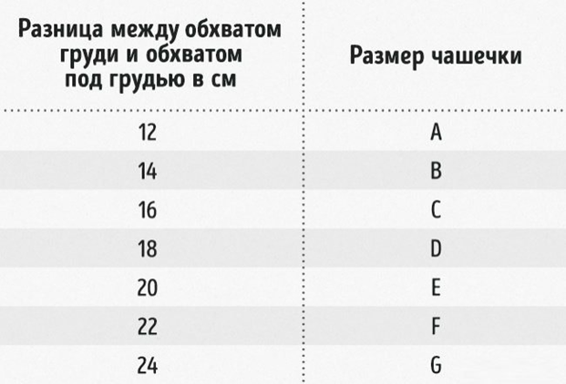 Объем чашки можно определить следующим образом: вычесть из обхвата груди обхват под грудью.